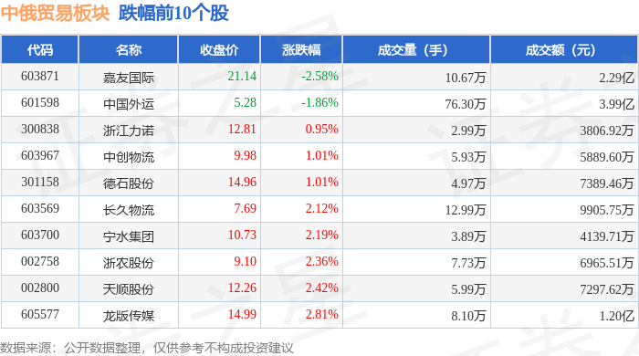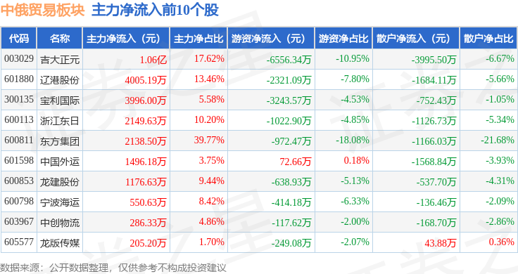 从资金流向上来看,当日中俄贸易板块主力资金净流入1.46亿元,游资资金净流出1.96亿元,散户资金净流入4971.29万元。中俄贸易板块个股资金流向见下表: