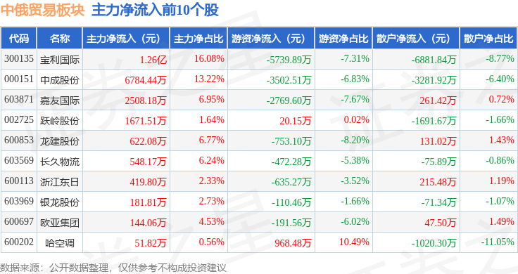从资金流向上来看,当日中俄贸易板块主力资金净流出1.21亿元,游资资金净流出8296.17万元,散户资金净流入2.04亿元。中俄贸易板块个股资金流向见下表: